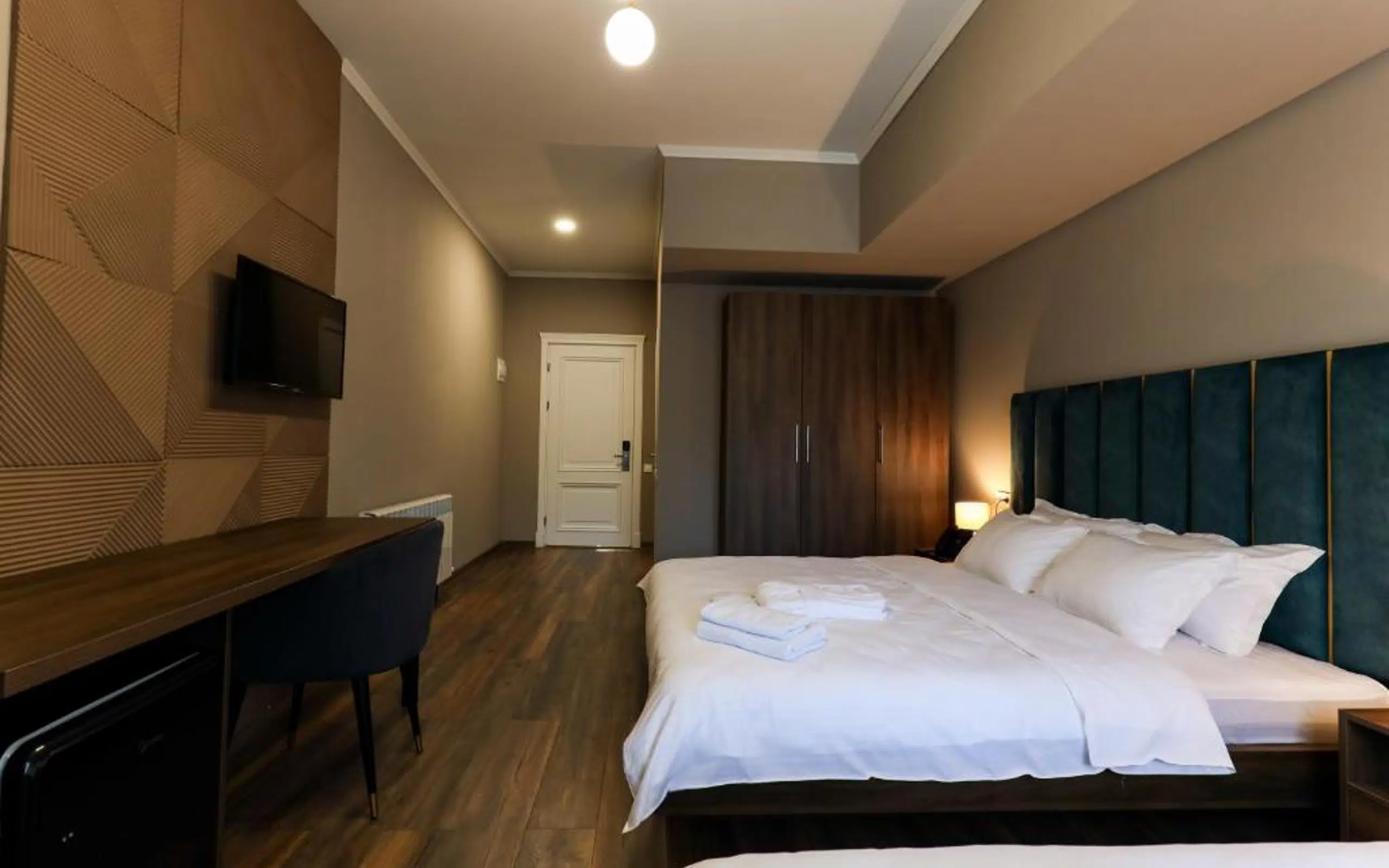 Learn moreExplore our hotel's modernist design, seamlessly blending style and function for a unique ambiance. Experience the comfort of our cozy rooms, providing a tranquil retreat during your stay. Step into our green yard, relax on the open terrace, and enjoy the convenience of our parking lot. Indulge in a culinary journey at our classic restaurant, where the flavors of Georgian and European cuisine come together, offering a diverse menu to satisfy every palate. Visit our vibrant bar, boasting an array of Georgian wines and contemporary cocktails.