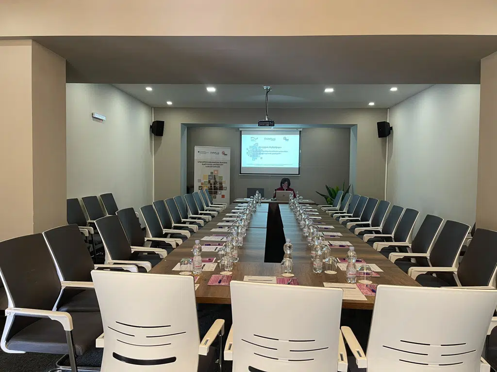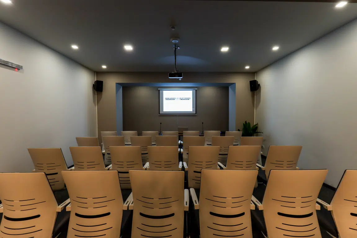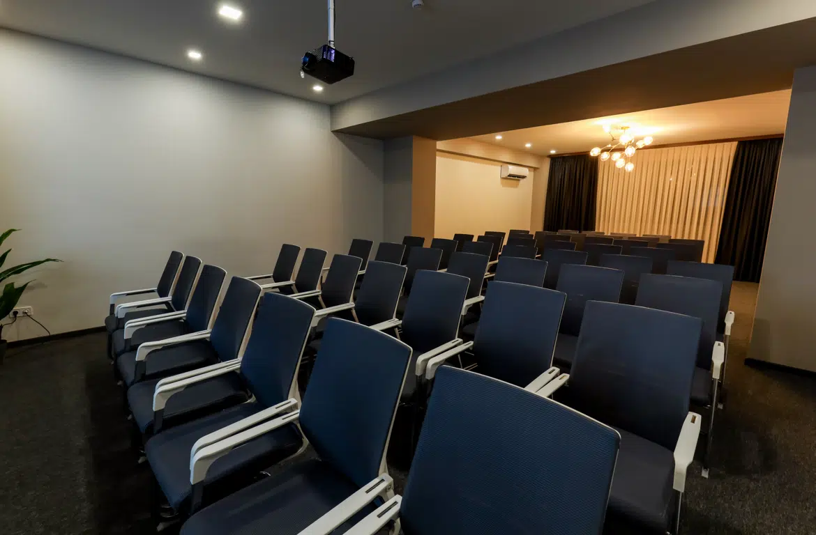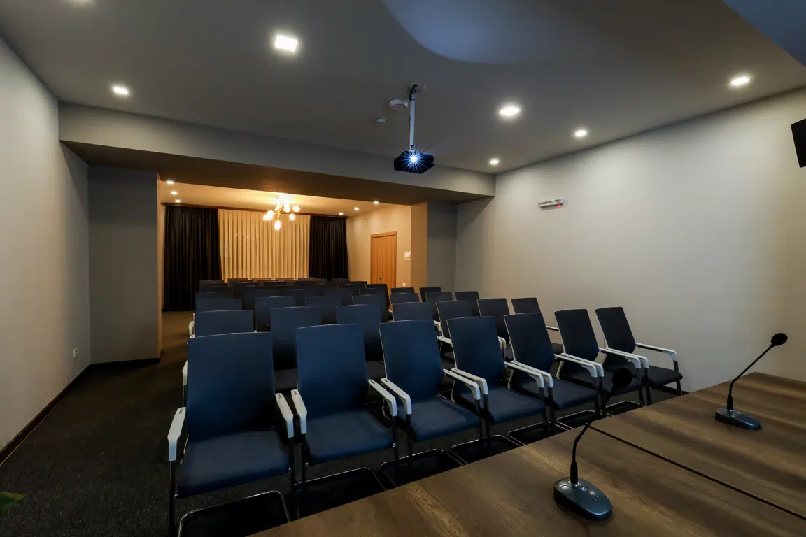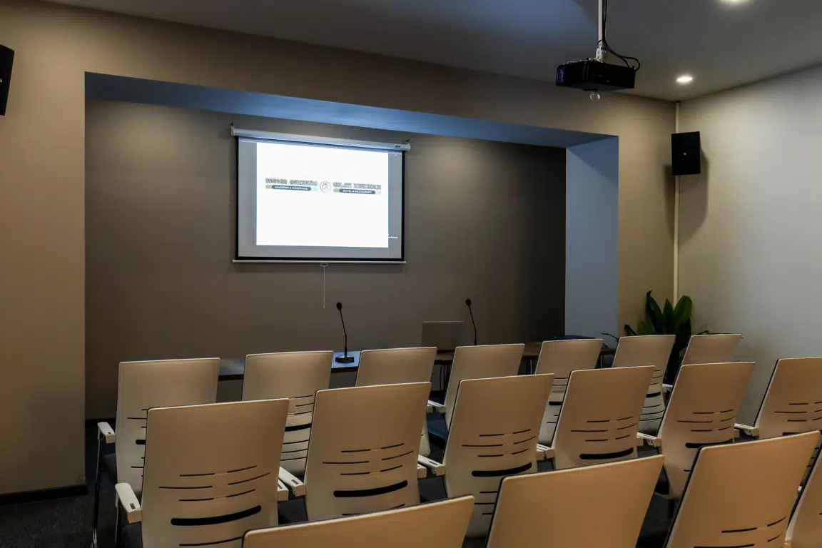 The conference room is a modern and well-lit space equipped with comfortable seating arranged in an organized manner to facilitate optimal viewing and engagement. The room features a large screen at the front for presentations, ensuring visibility from all seats. There are approximately 60 chairs arranged in neat rows, providing ample seating capacity. The room has all necessary technical equipment.Sitting Arrangements: